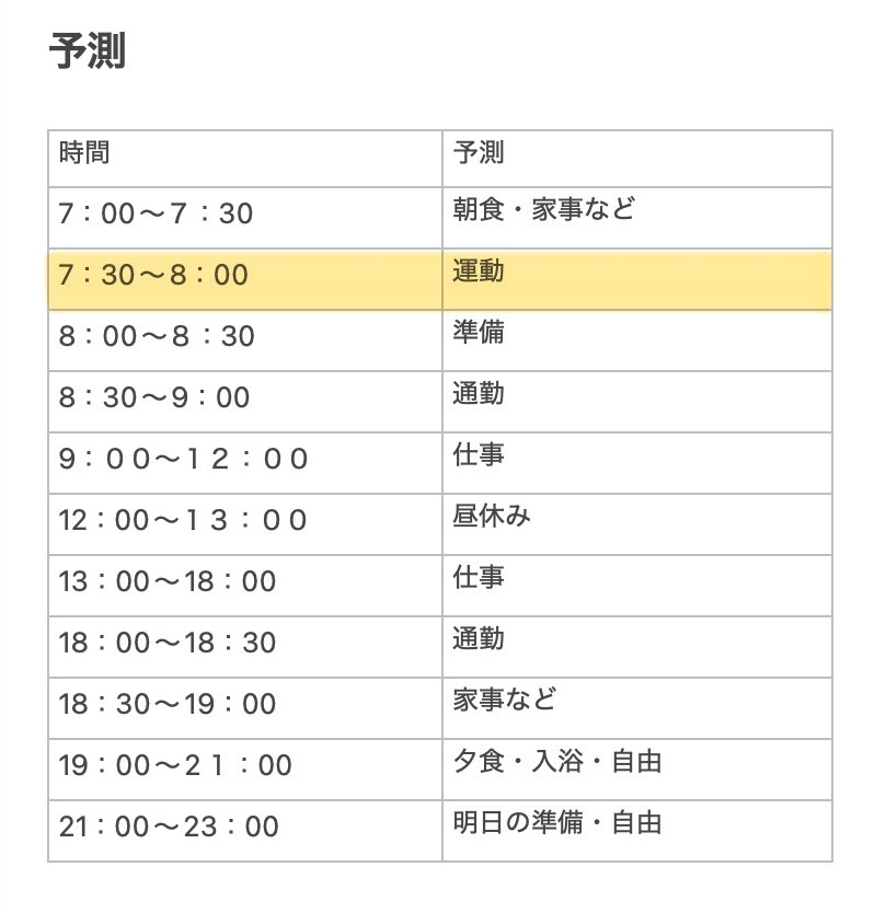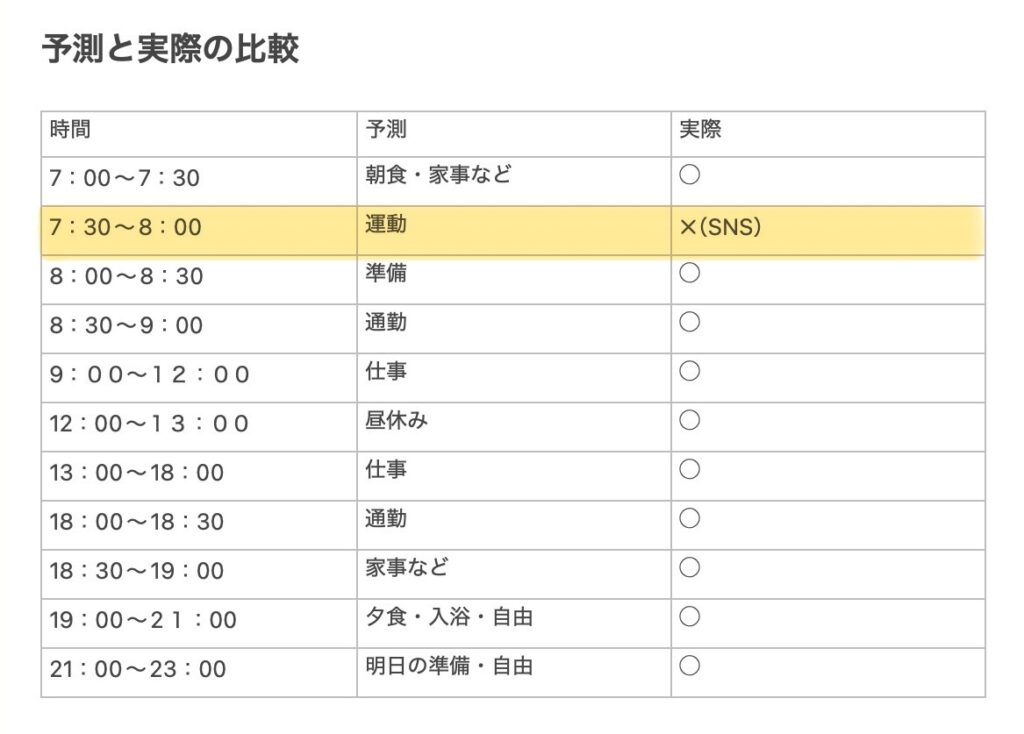 1日の予測と実際の記録ができたら、同じフォーマットを1週間分横に並べて見るだけです。
